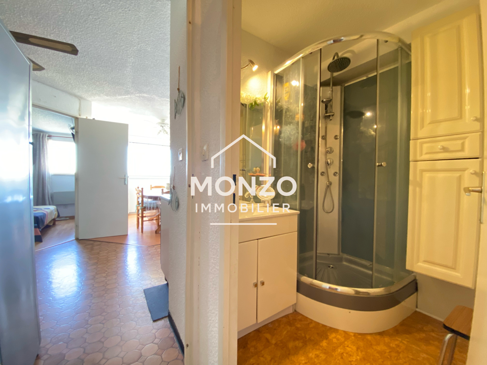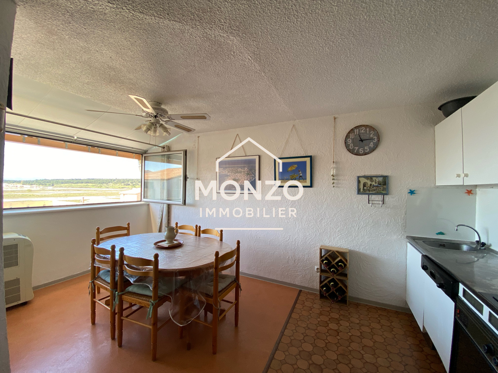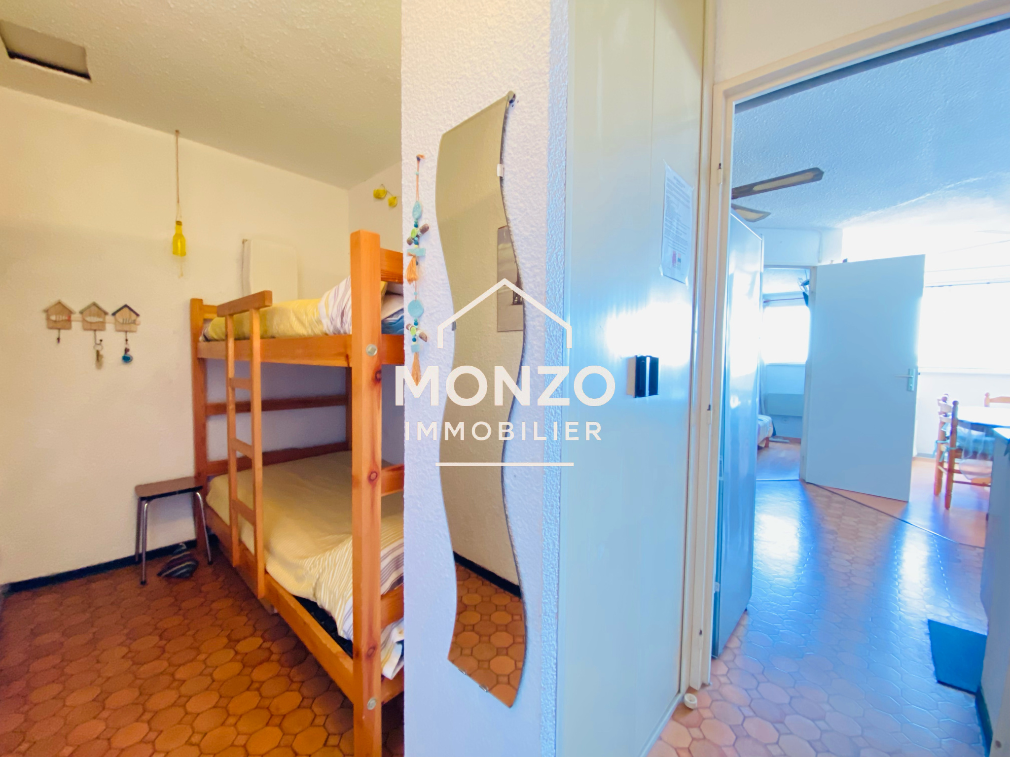 Gruissan (11430)Appartement T2 au 3ème étage comprenant une entrée avec coin cabine pour un lit superposé, un WC, une salle d'eau, une chambre, une pièce de vie avec cuisine, avec une trés belle vue sur les salins et une exosition sud-ouest.