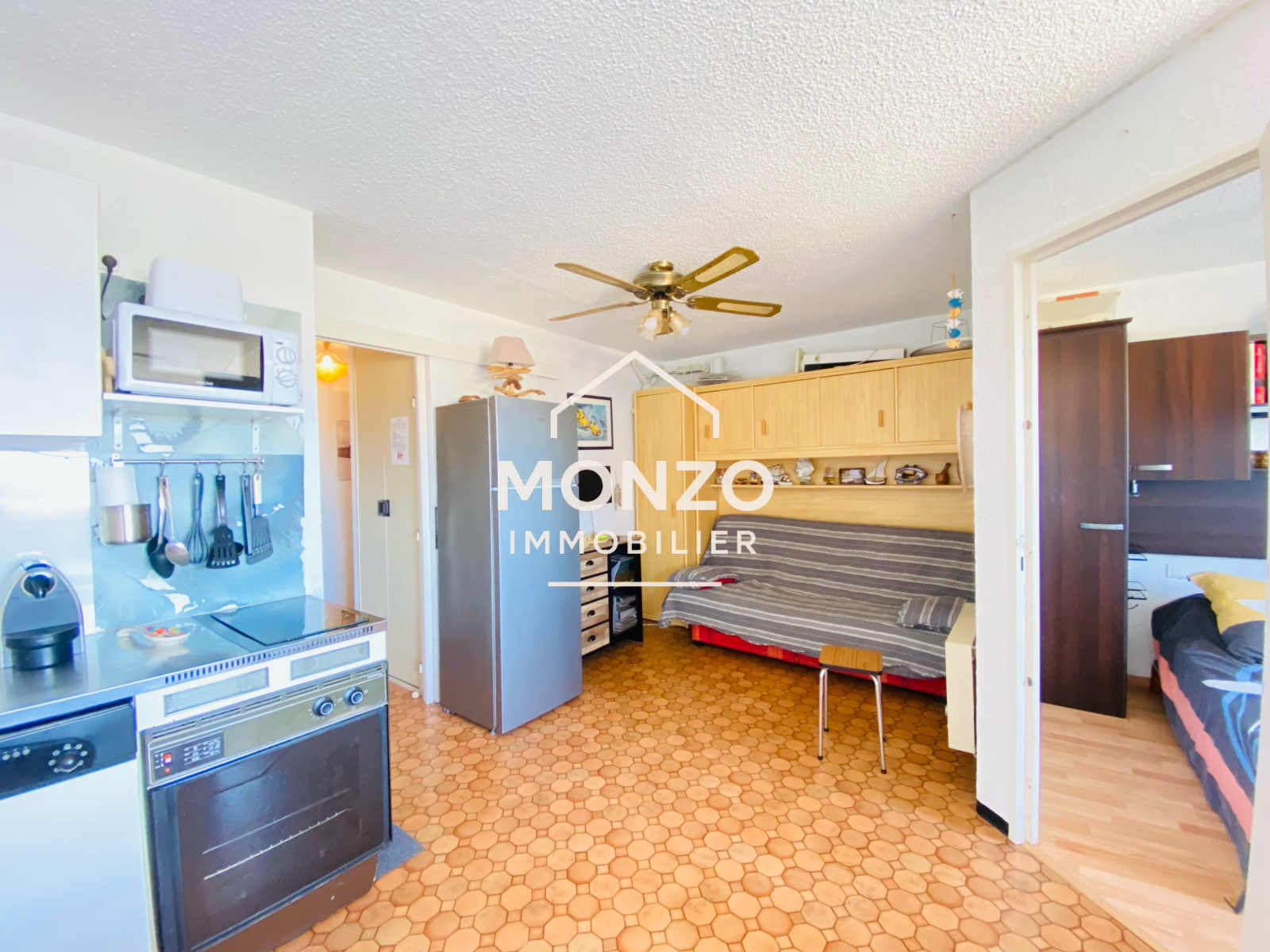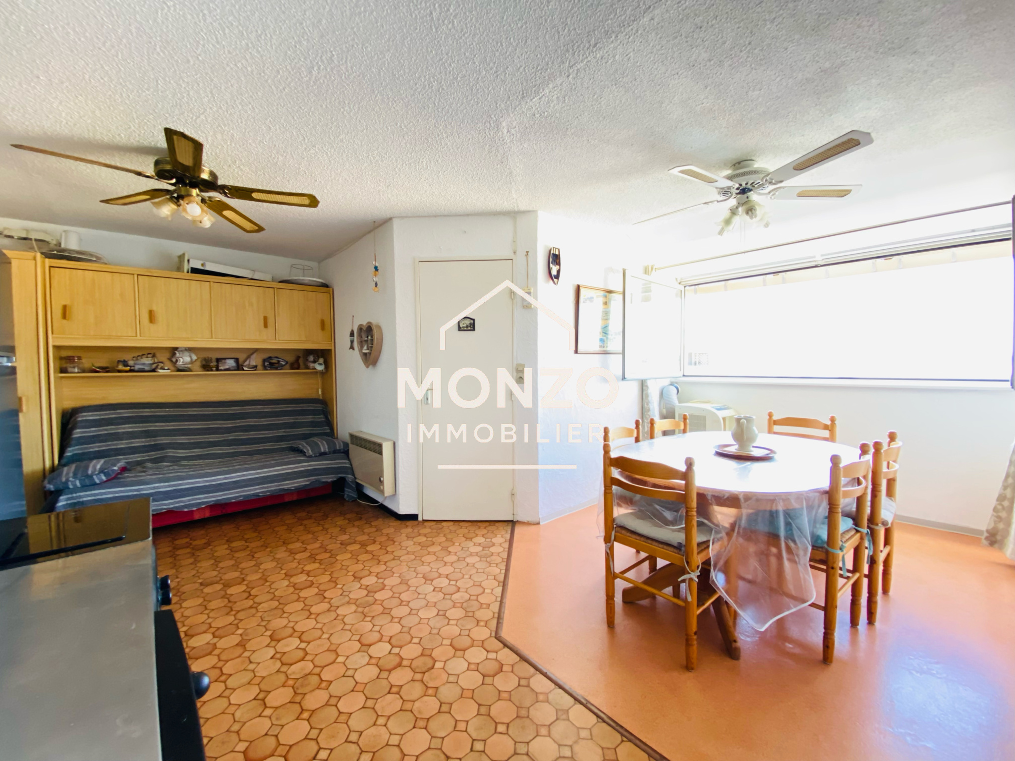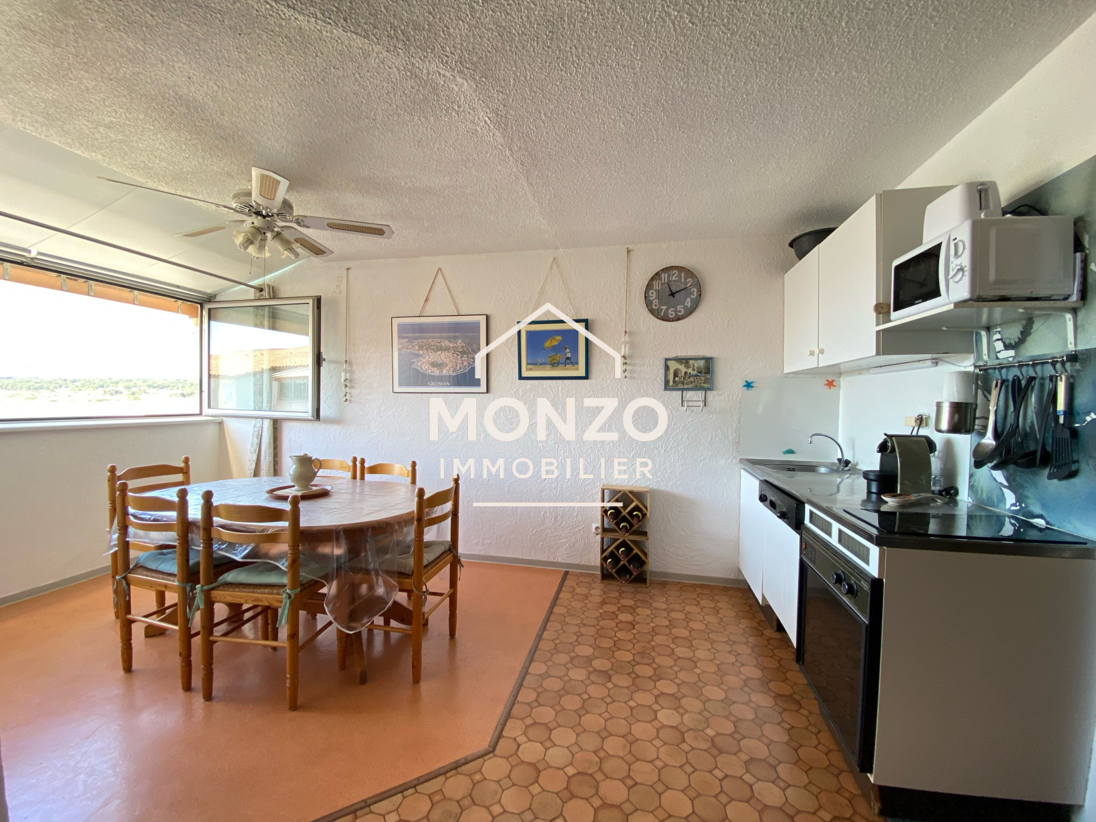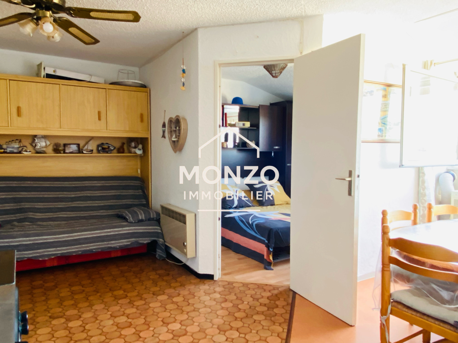 Gruissan (11430)Appartement T2 au 3ème étage comprenant une entrée avec coin cabine pour un lit superposé, un WC, une salle d'eau, une chambre, une pièce de vie avec cuisine, avec une trés belle vue sur les salins et une exosition sud-ouest.