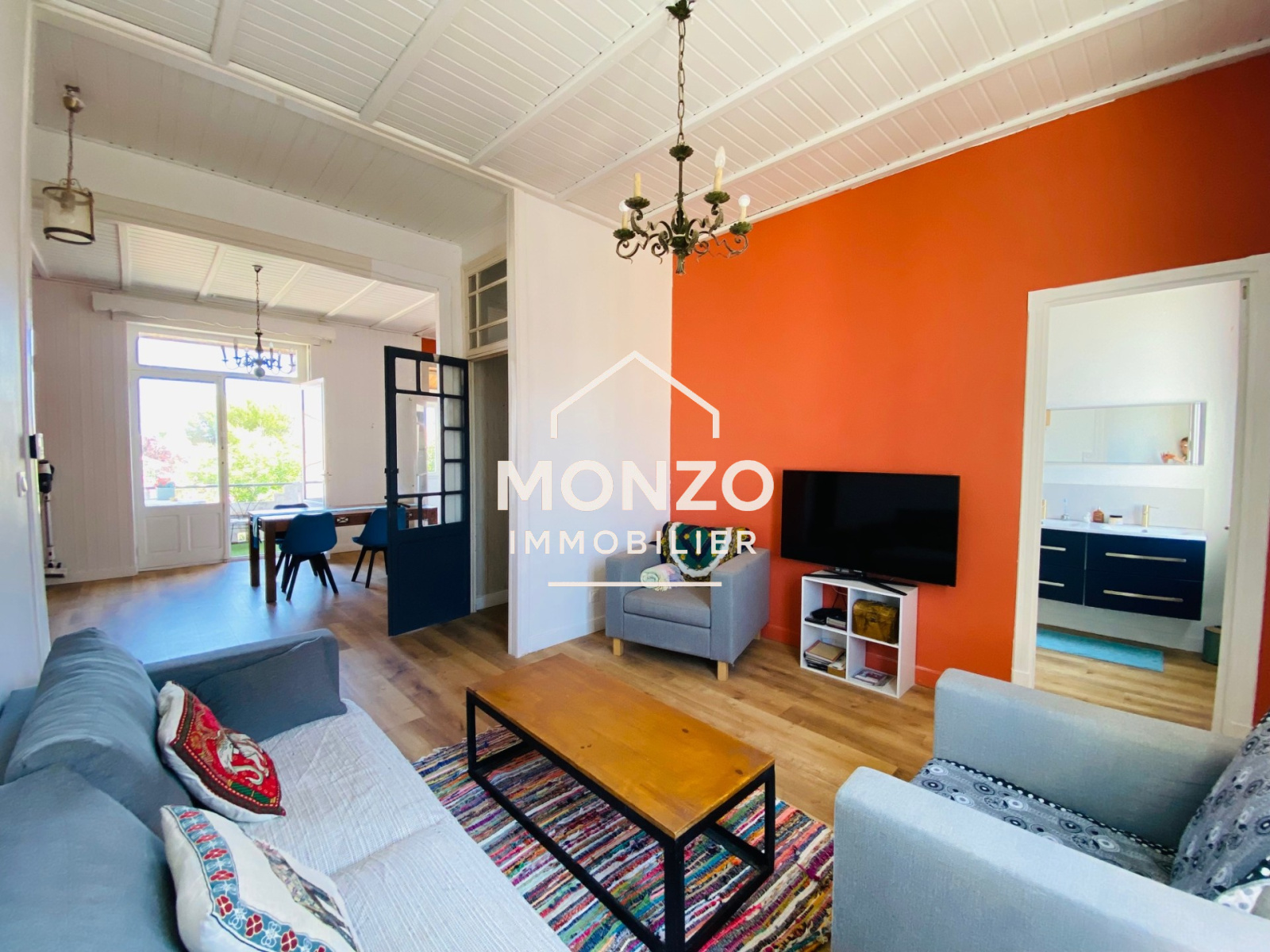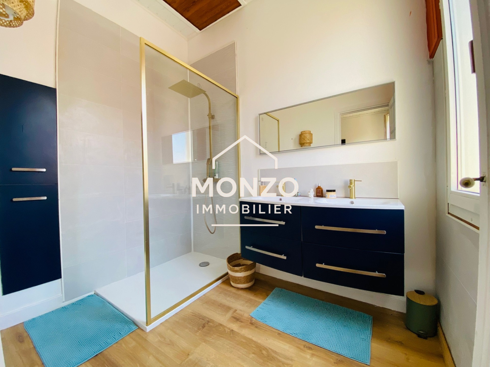 A l'étage, deux chambres, une salle d'eau avec douche à l'italienne, un WC séparé, et une belle pièce de vie lumineuse avec de grandes ouvertures, comprenant une cuisine ouverte aménagée et équipée donnant sur une terrasse avec vue sur le jardin.