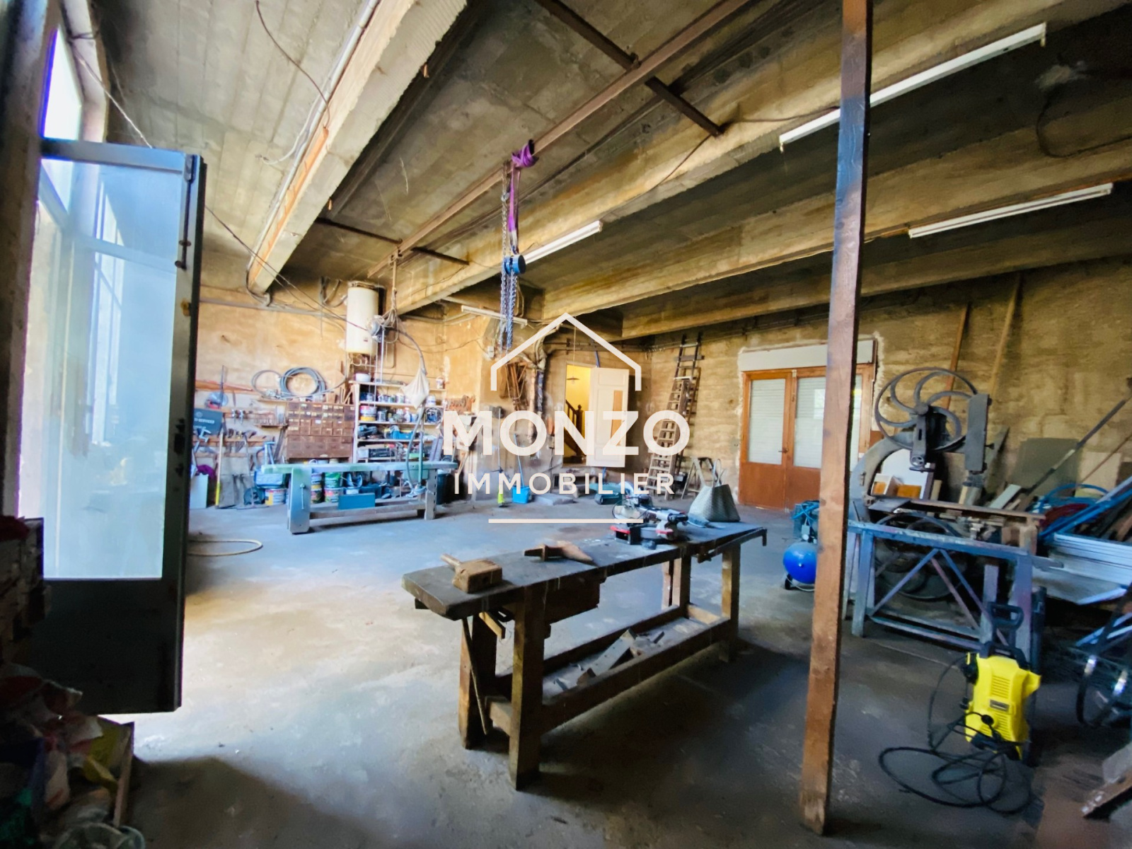 Cette maison d'une superfie de 250m² comprend en rez de chaussée un grand atelier d'environ 100m², trois garages, une cave en sous-sol et un appartement T2 indépendant avec une chambre, une cuisine, une salle d'eau et un WC, le tout donnant sur le jardin.