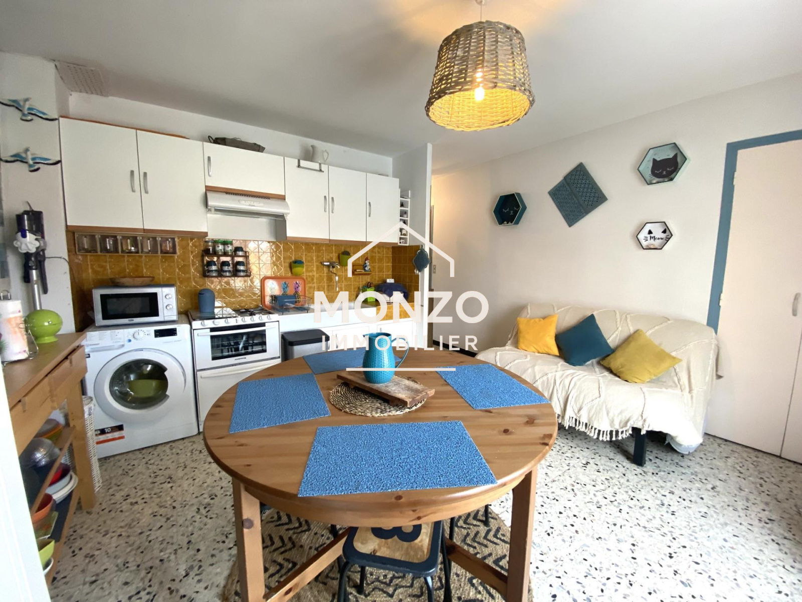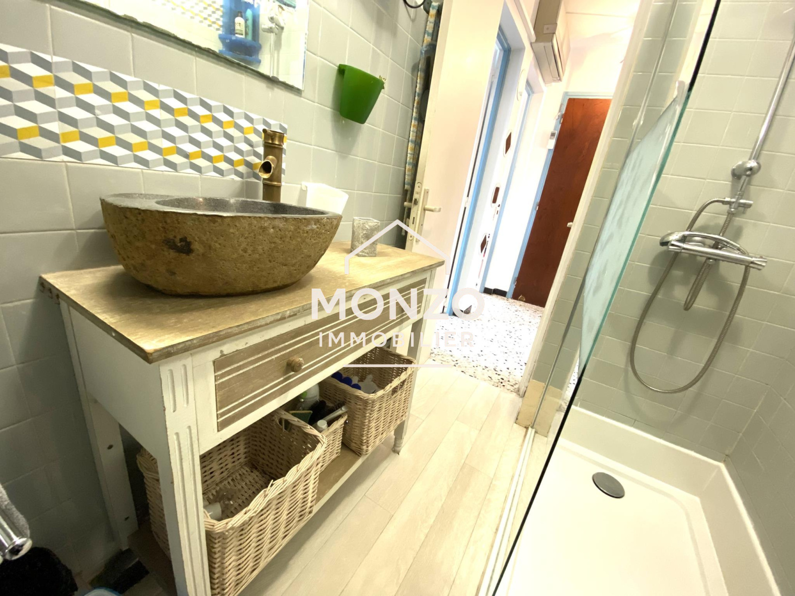 Un hall d'entrée, une pièce principale avec cuisine ouverte, équipée et aménagée, une salle d'eau avec douche à l'italienne , un wc séparé et 2 grandes chambres dont l'une a un accès directement sur un balcon de 6.1 m².