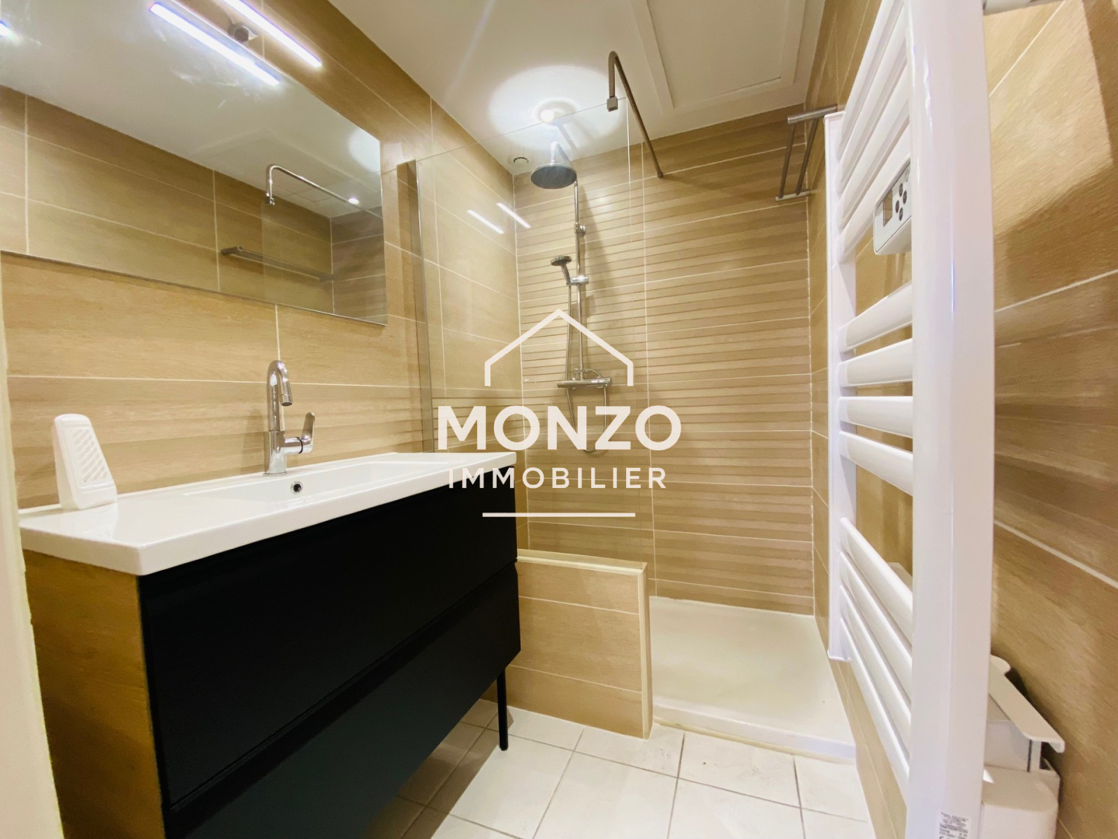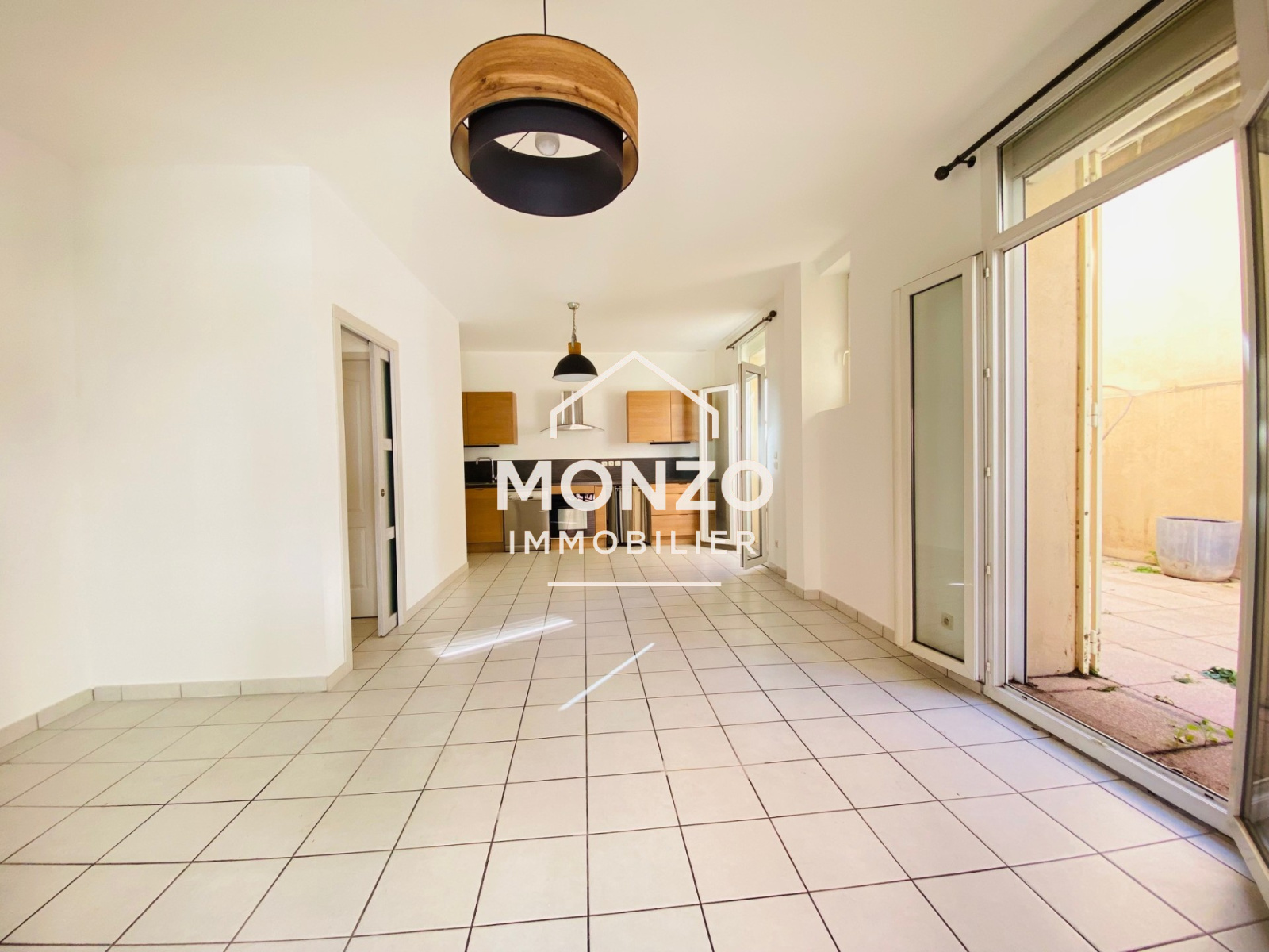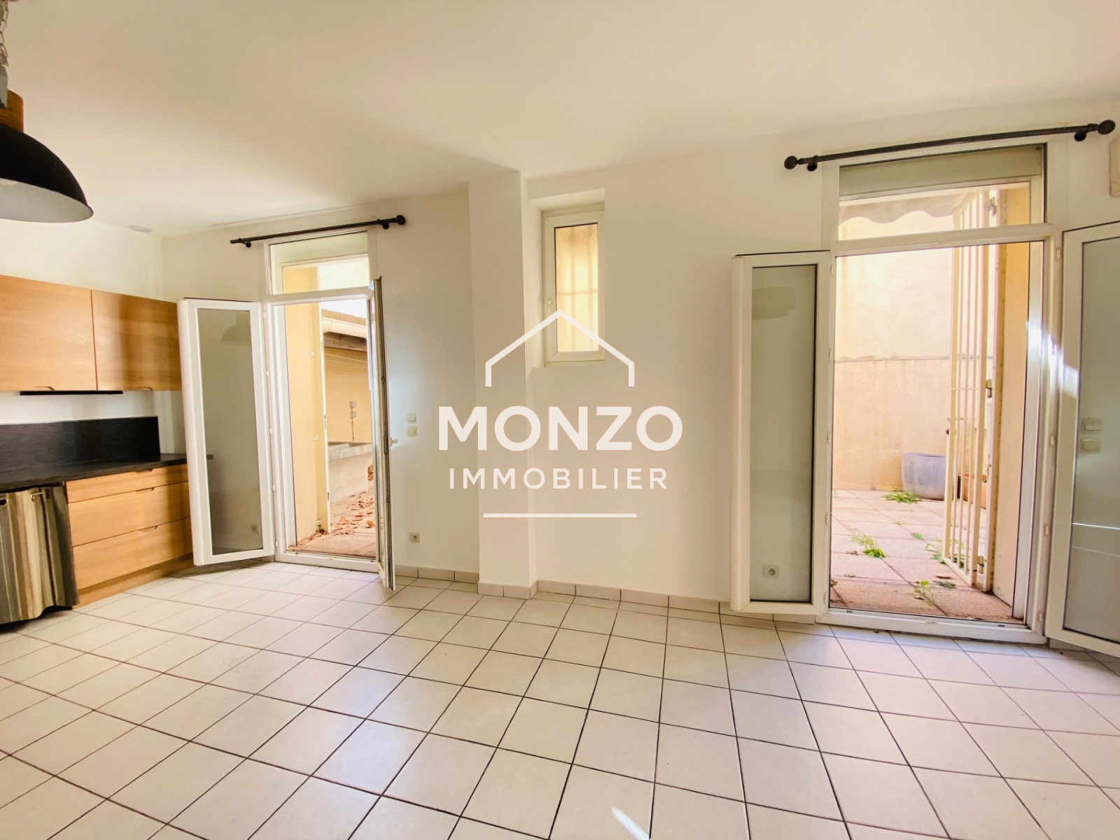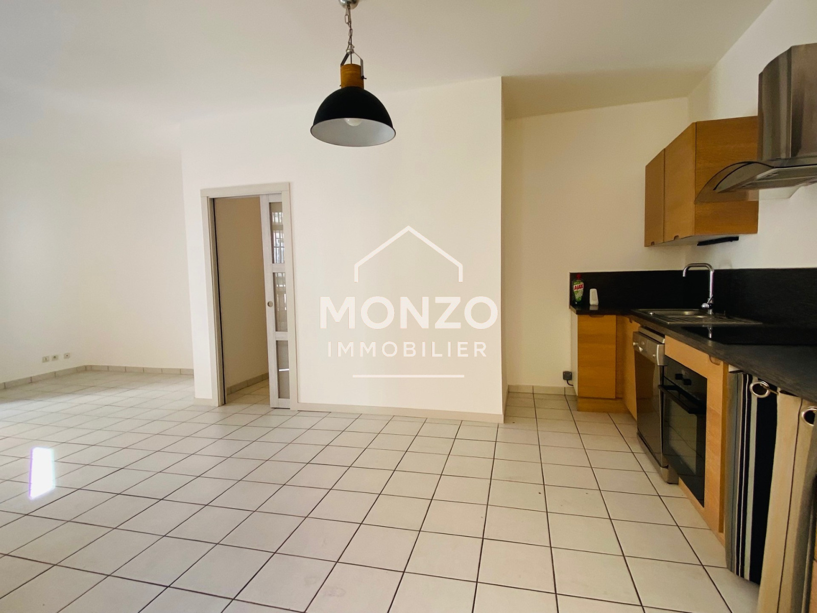 La partie pièce de vie se compose d'une cuisine aménagée et équipée (four, plaque vitrocéramique, hotte et lave-vaisselle) ouverte sur le salon/séjour lumineux donnant accès à la terrasse par 2 portes fenêtres équipées de grilles de fermeture de sécurité.