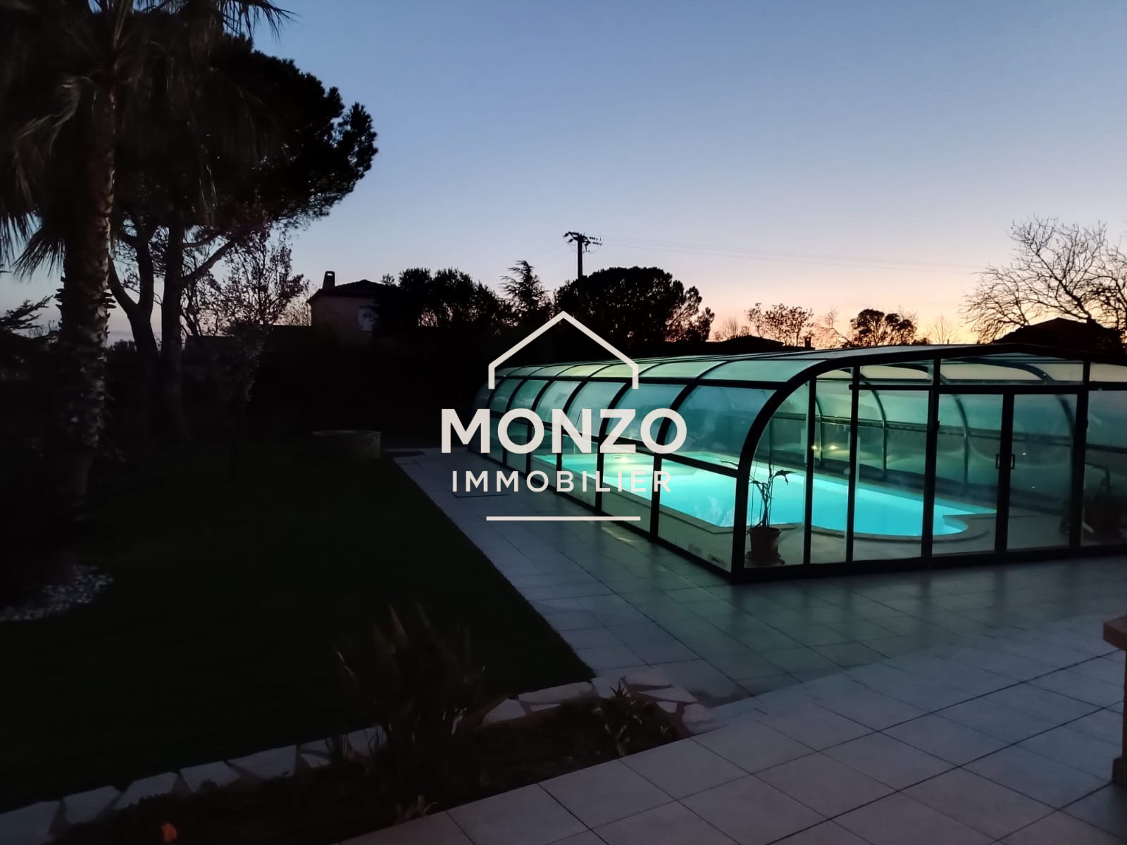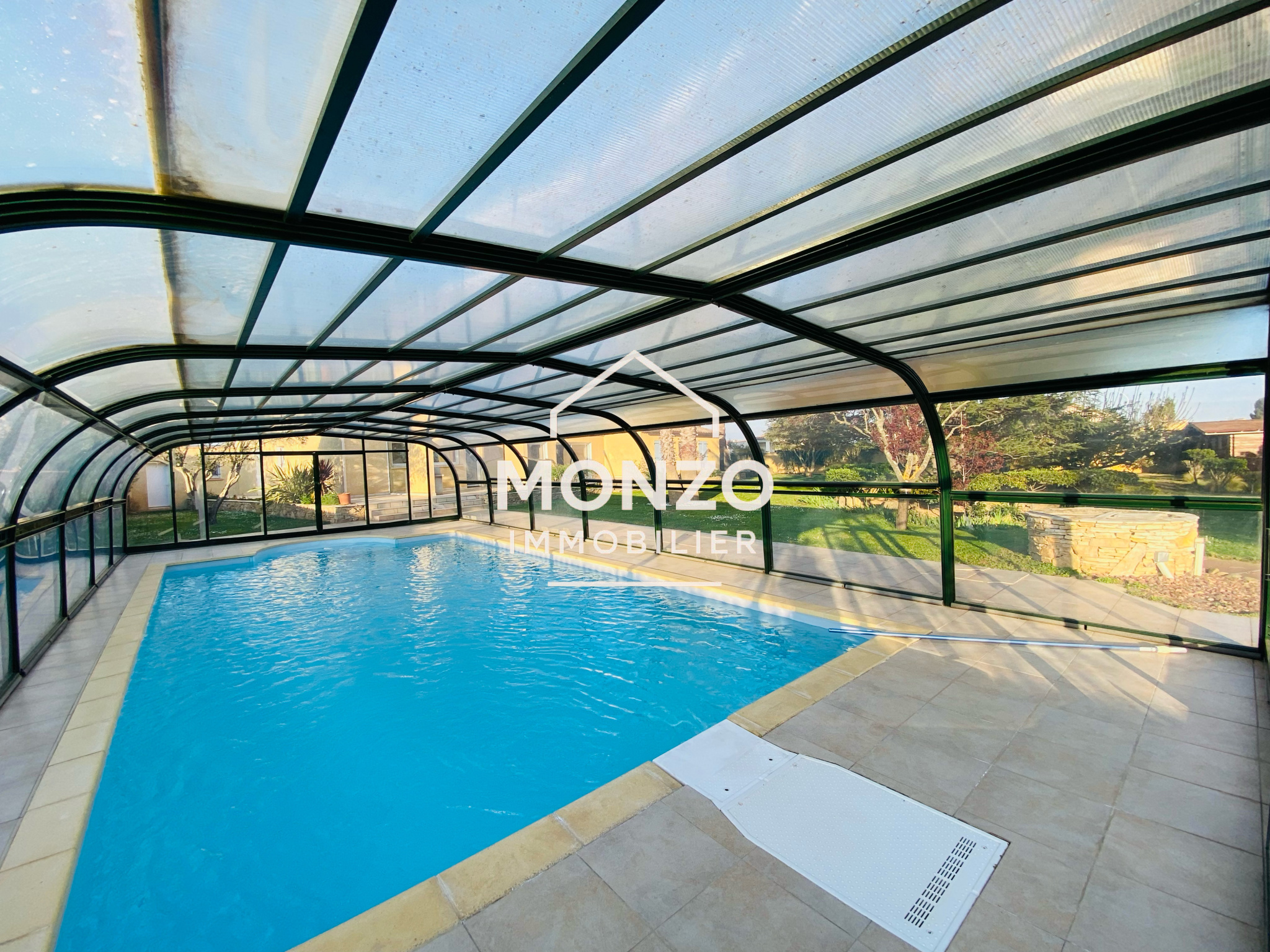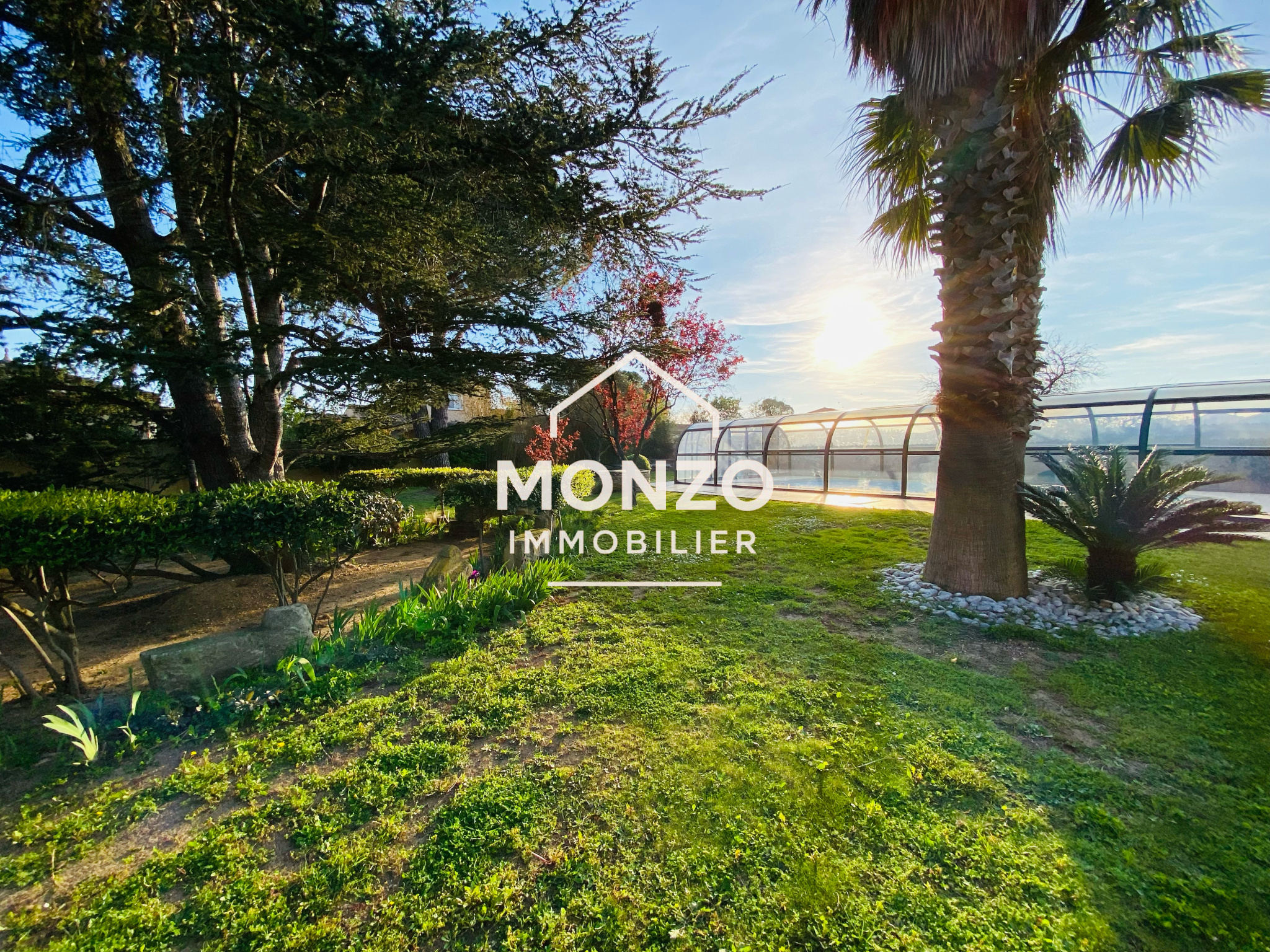 La villa s’étend sur un parc arboré entourant entièrement la maison, offrant un cadre verdoyant et intimiste avec une grande piscine (5 x 10 m) couverte, permettant une utilisation aussi bien en saison estivale qu’une grande partie de l’année.